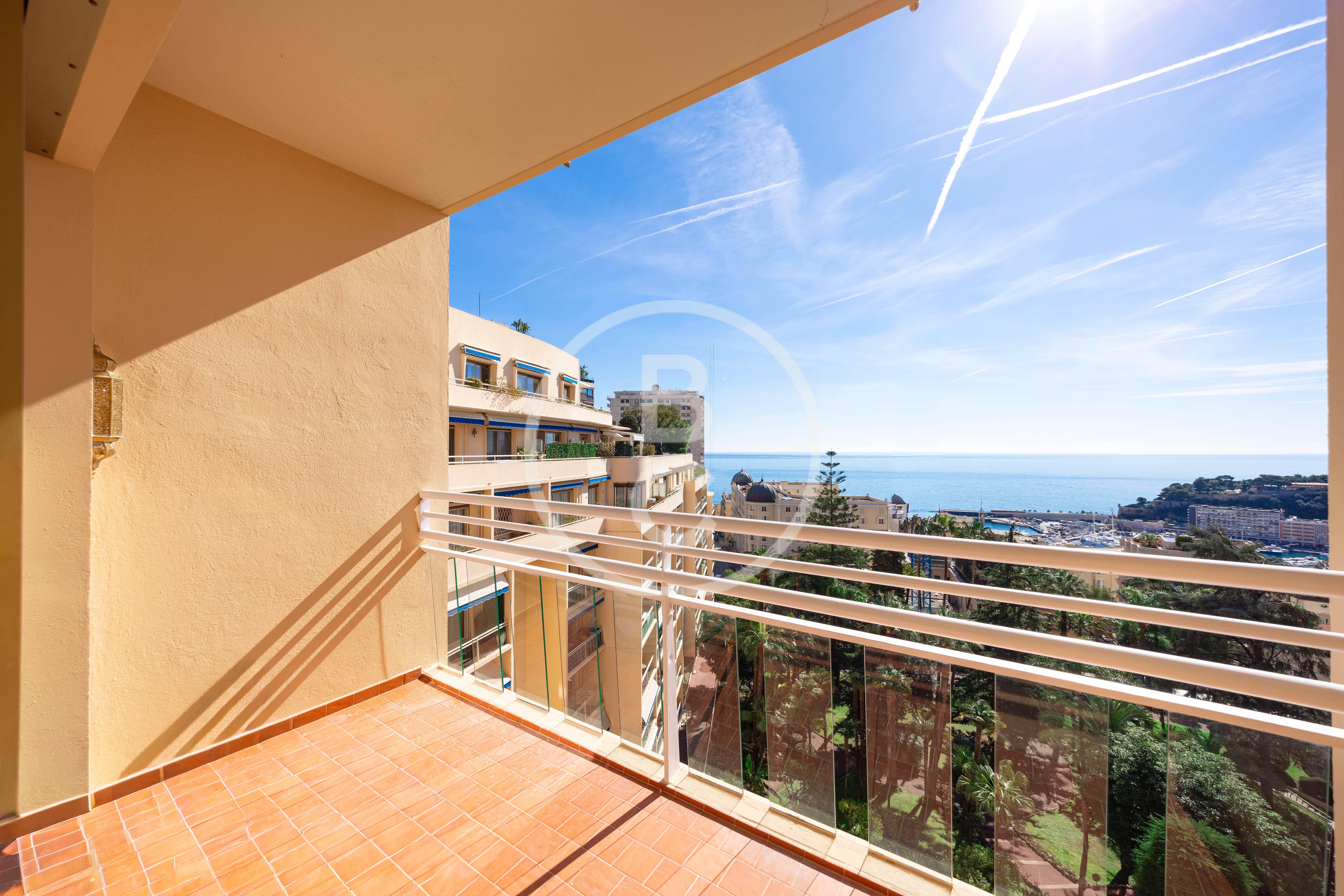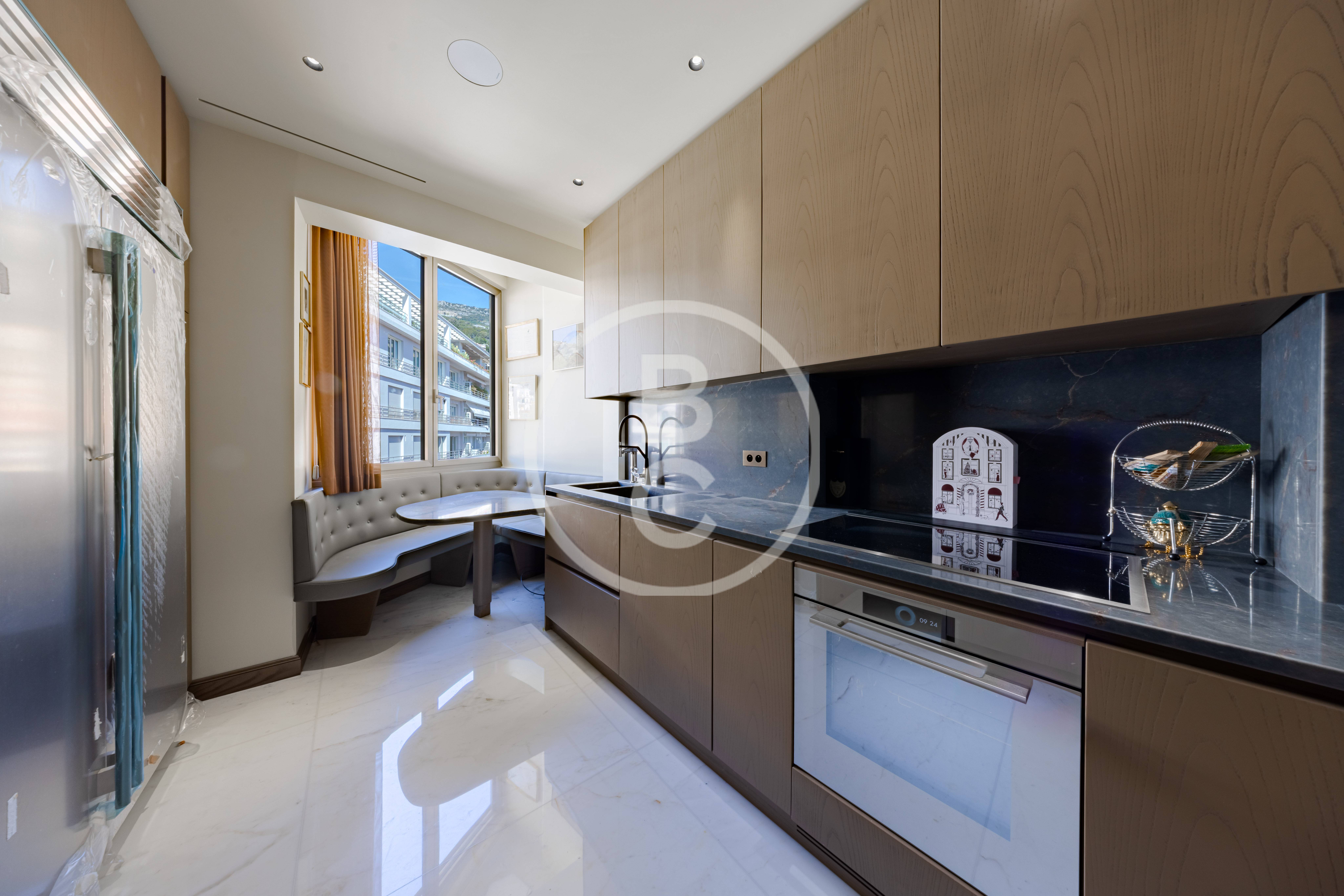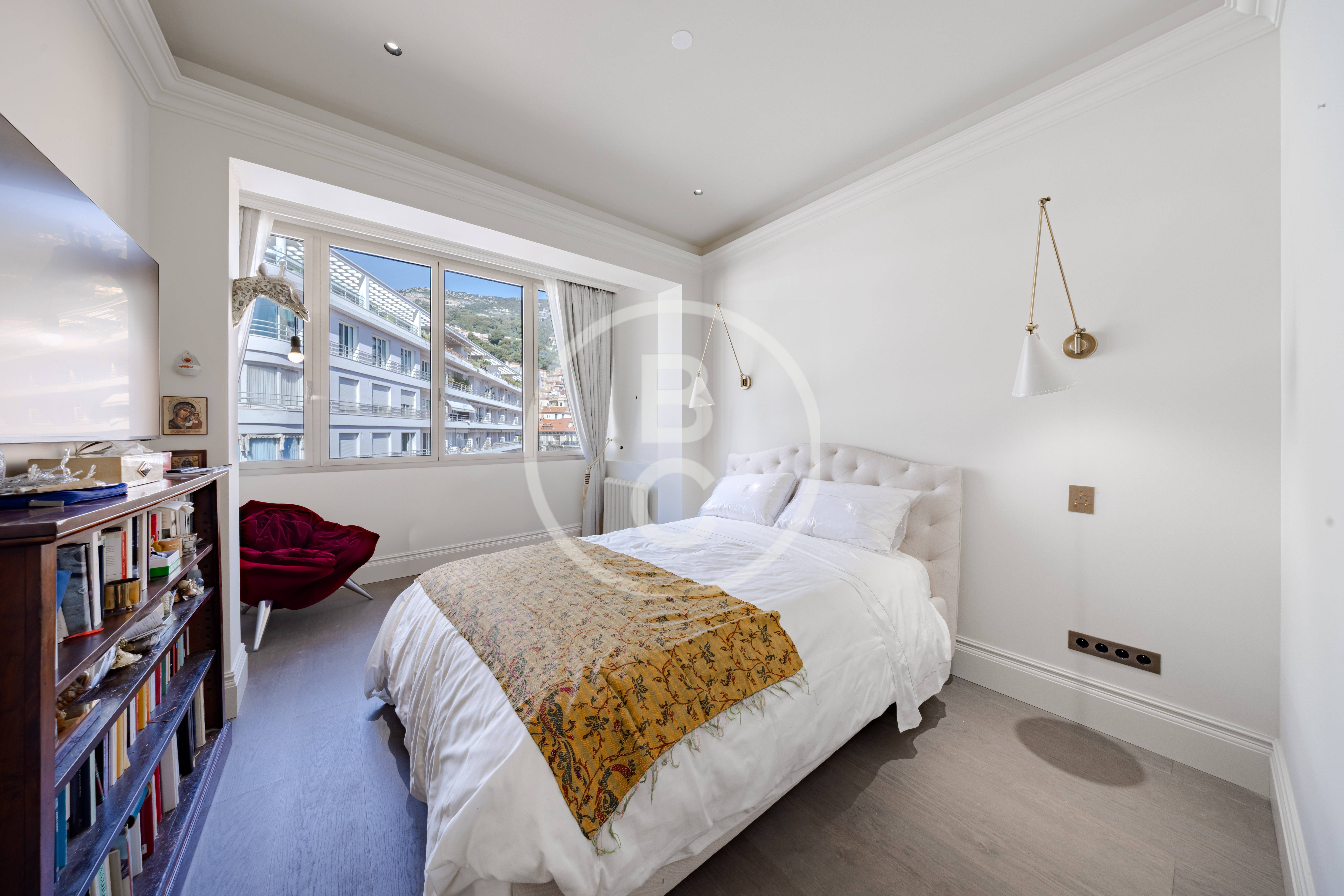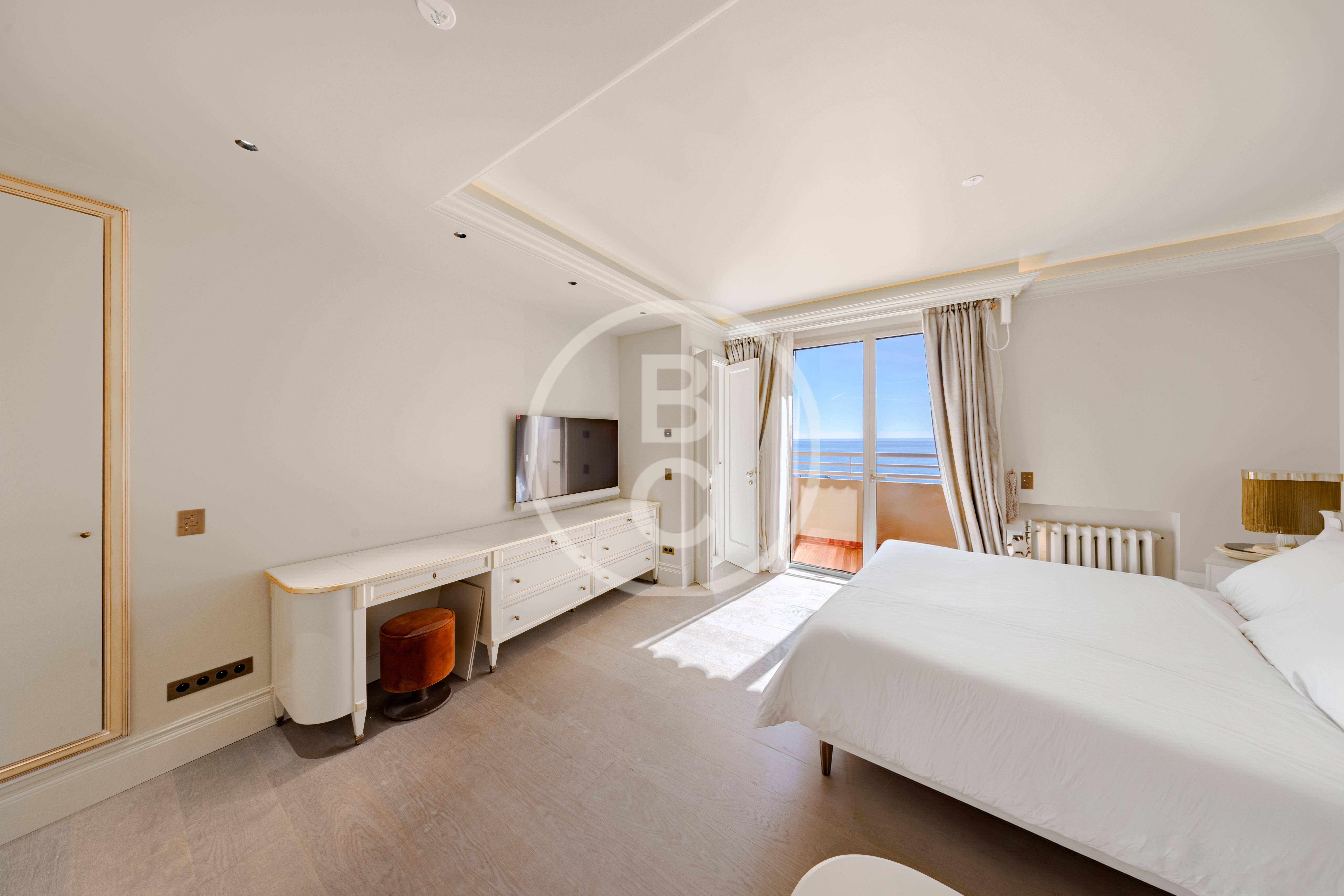 Cet appartement, entièrement rénové avec des matériaux haut de gamme et jamais habité, offre un spacieux double séjour très lumineux avec deux balcons bénéficiant d’une agréable vue mer et jardins.