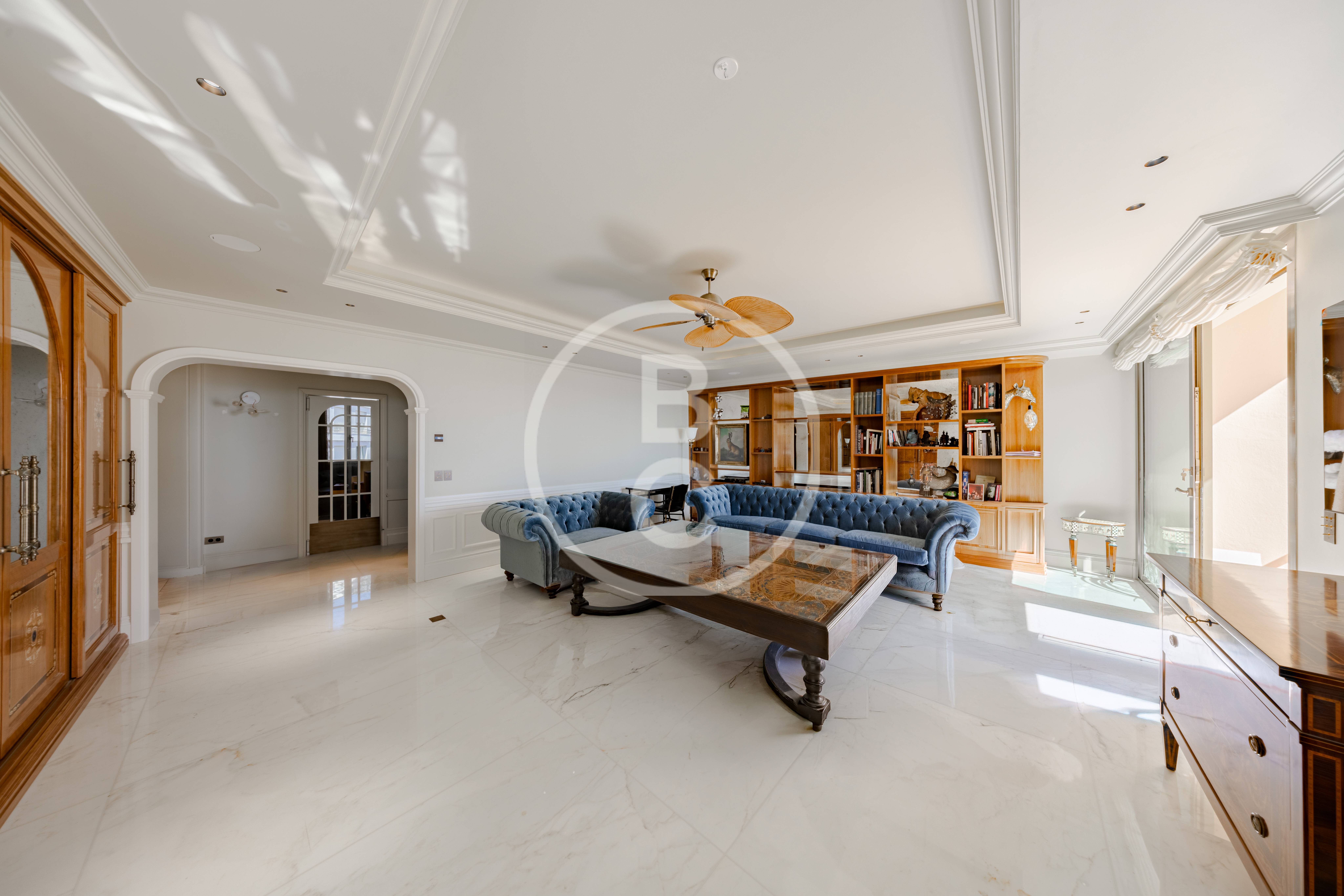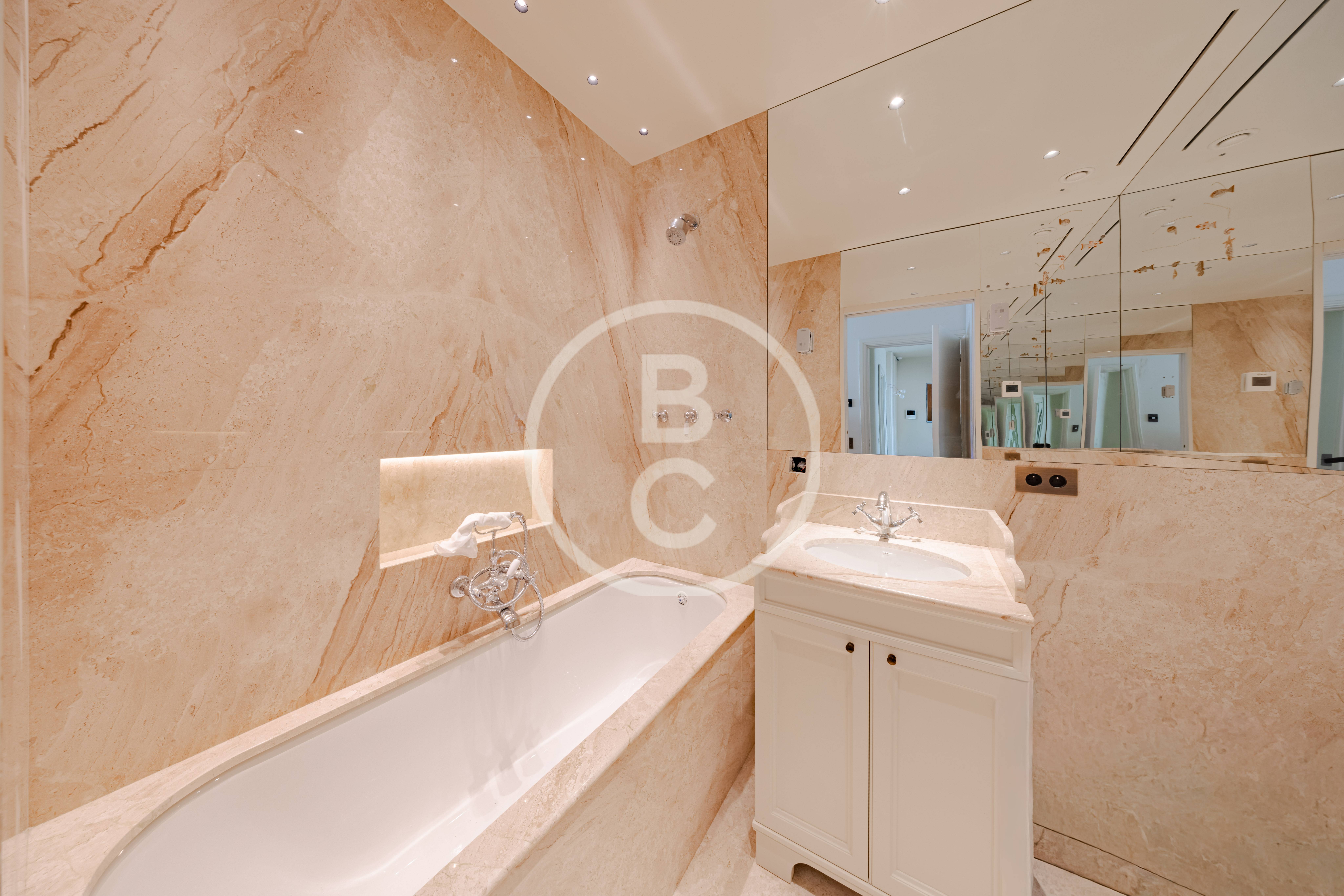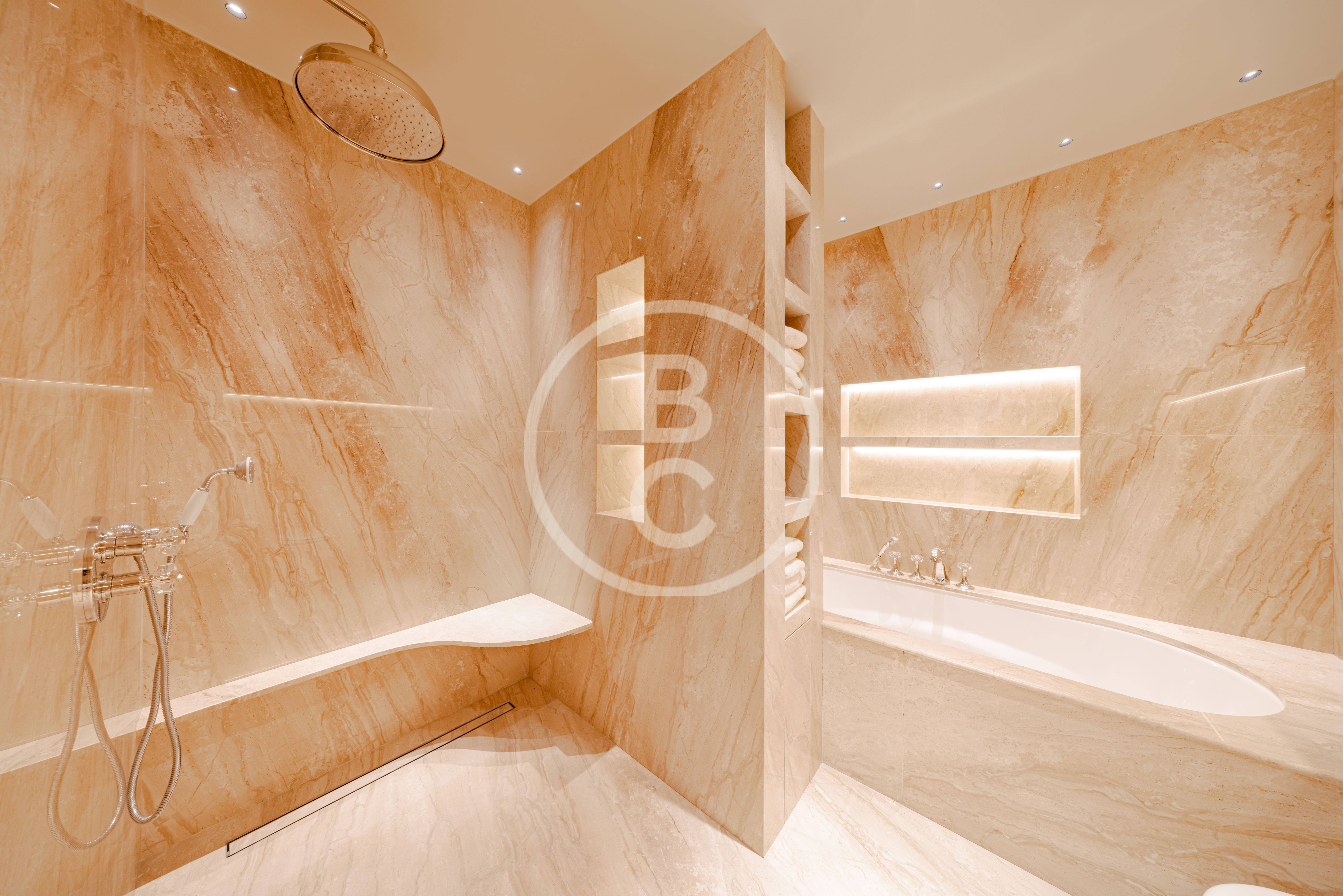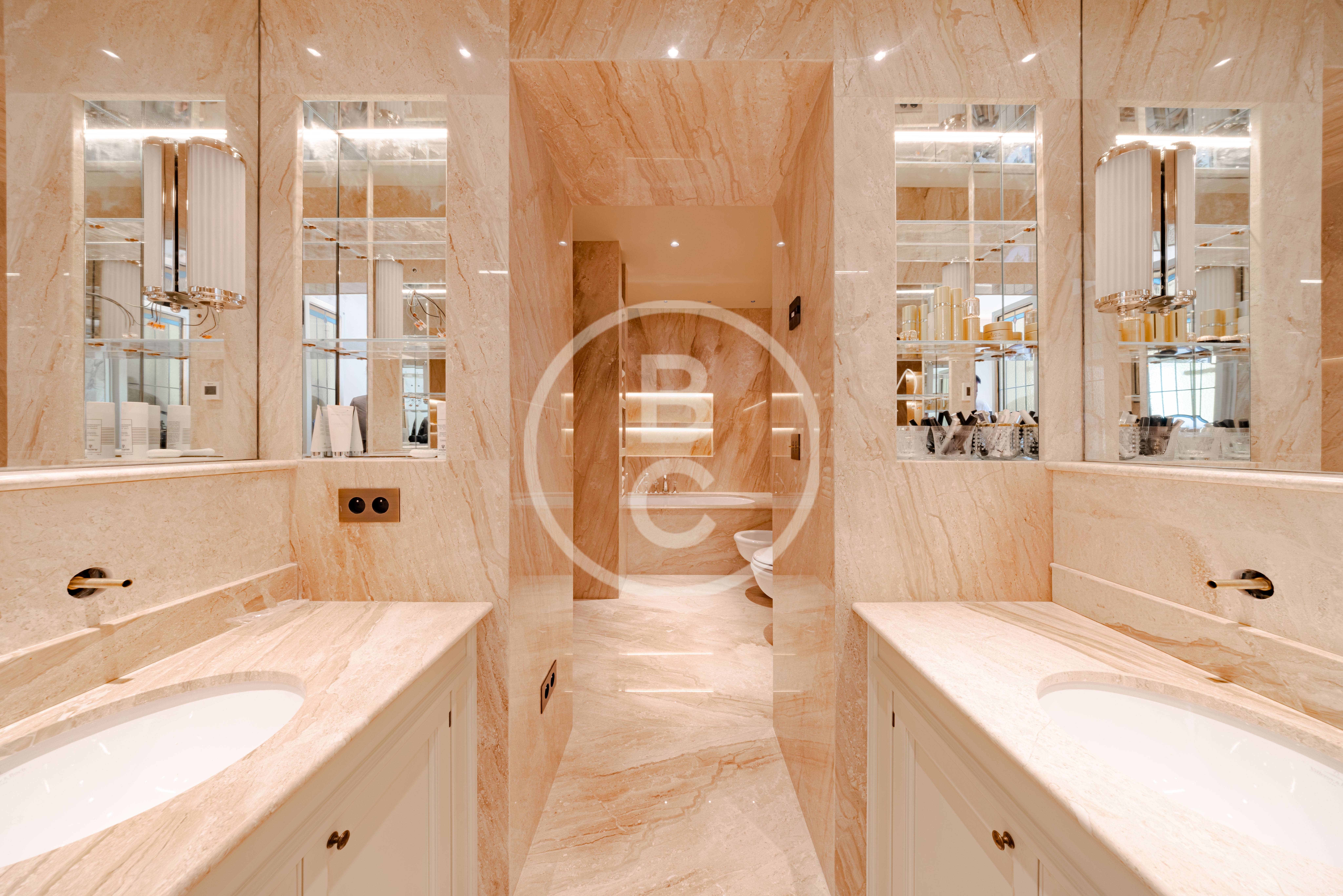 Il dispose d’une cuisine séparée, d’une entrée de service, ainsi que de salles de bains élégantes en marbre.