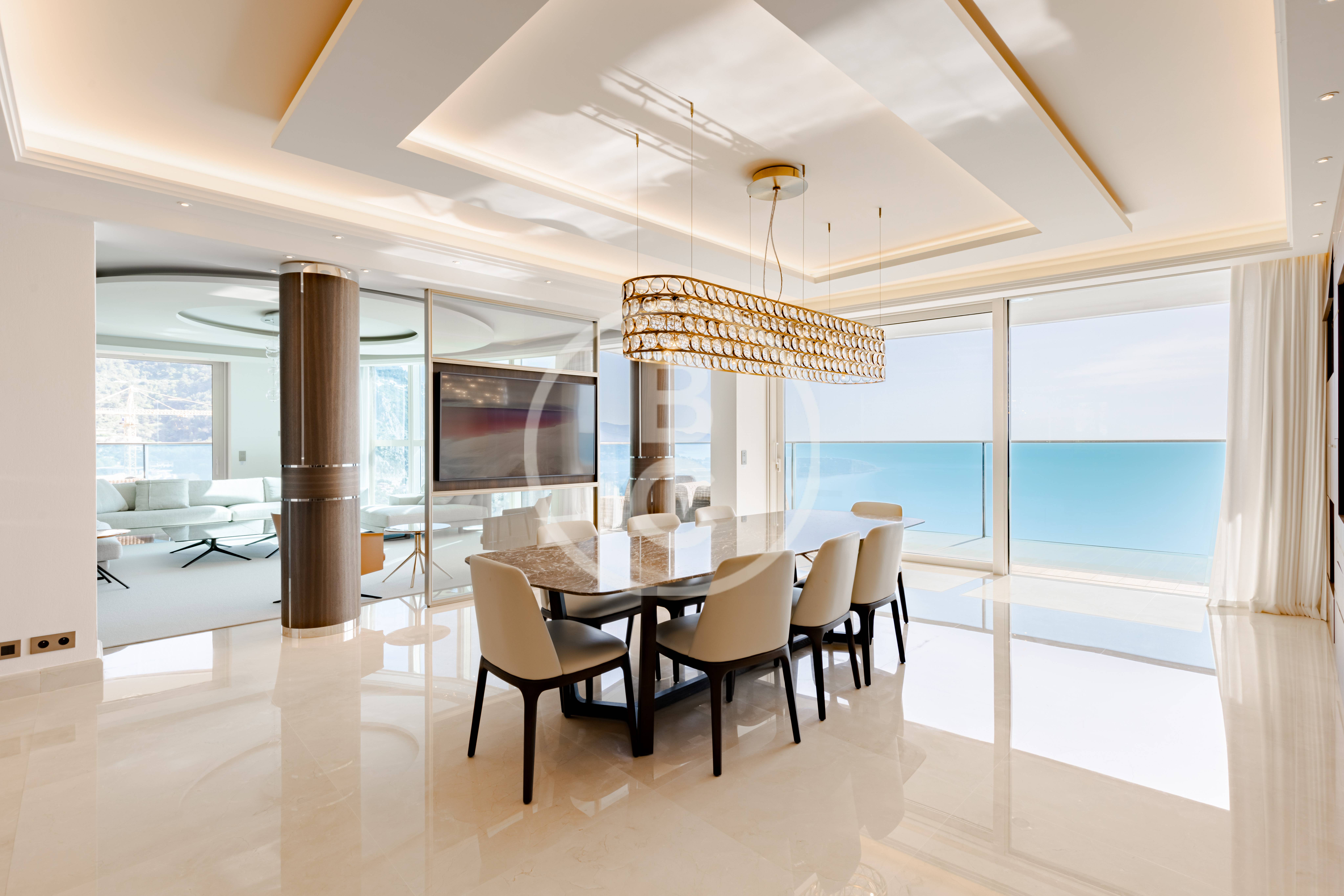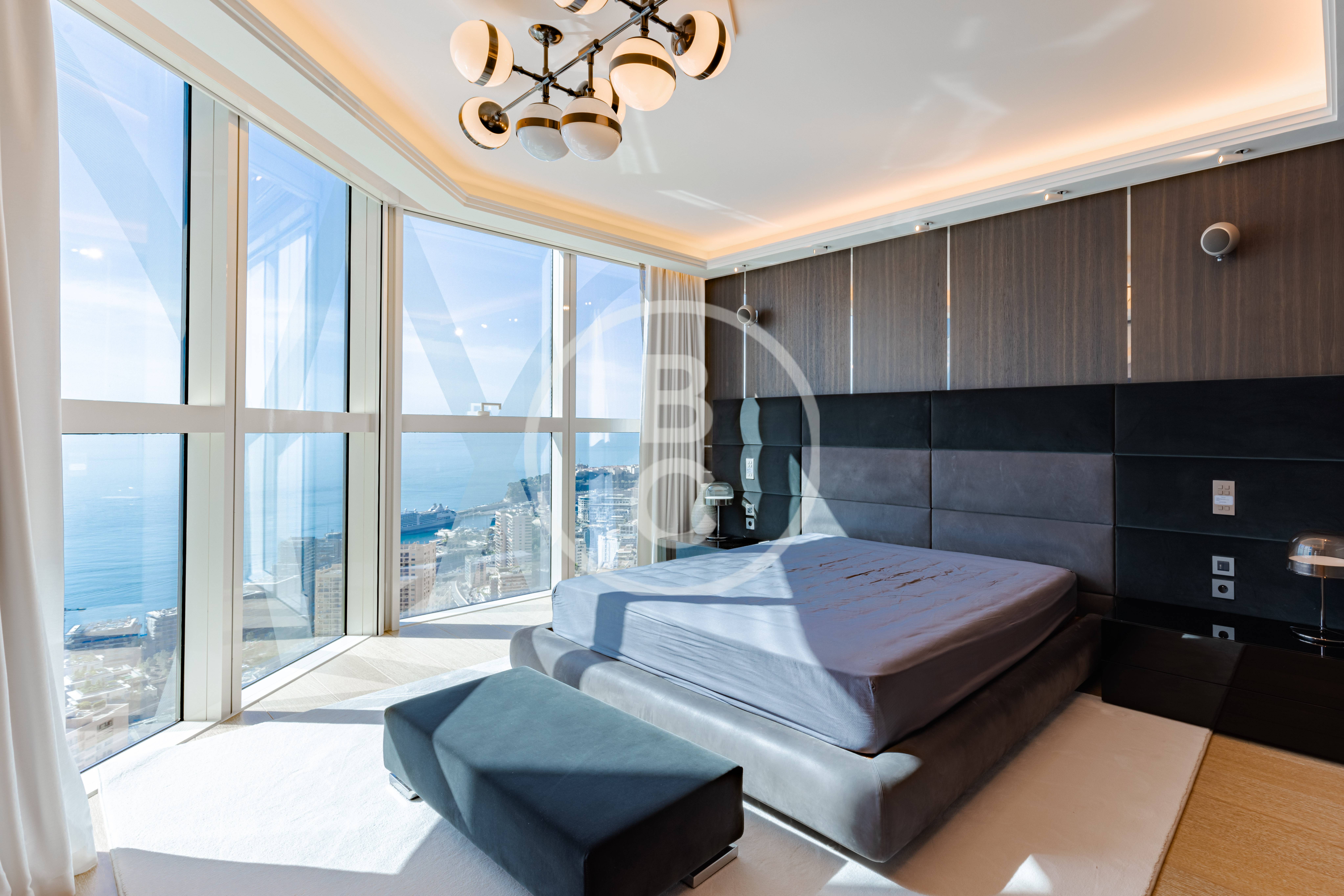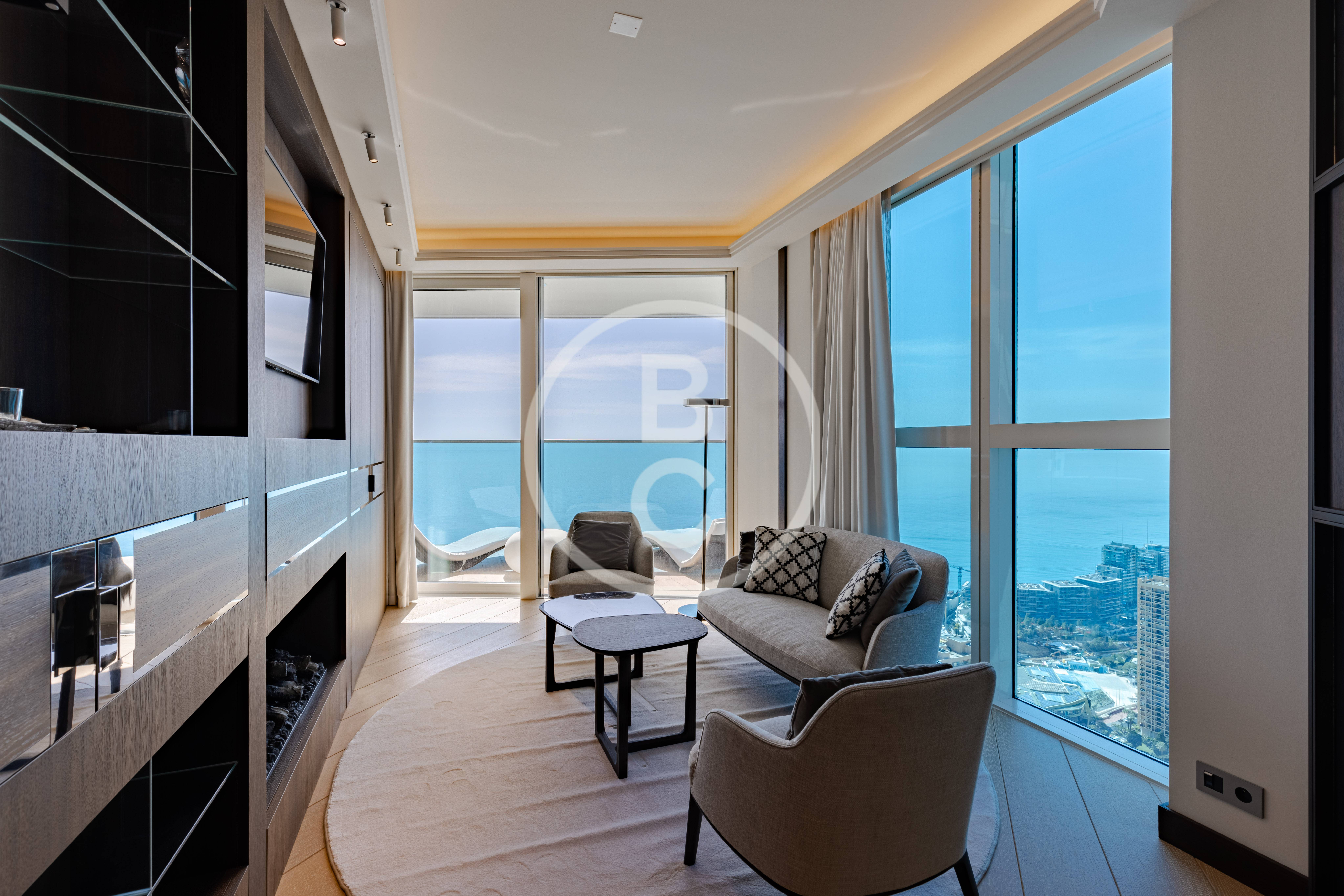 Cet appartement d'exception est situé dans les plus hauts étages de la célèbre Tour Odéon. Meublé et décoré par un architecte de renom, ce 6 pièces propose un style unique, façonné avec des matériaux nobles.