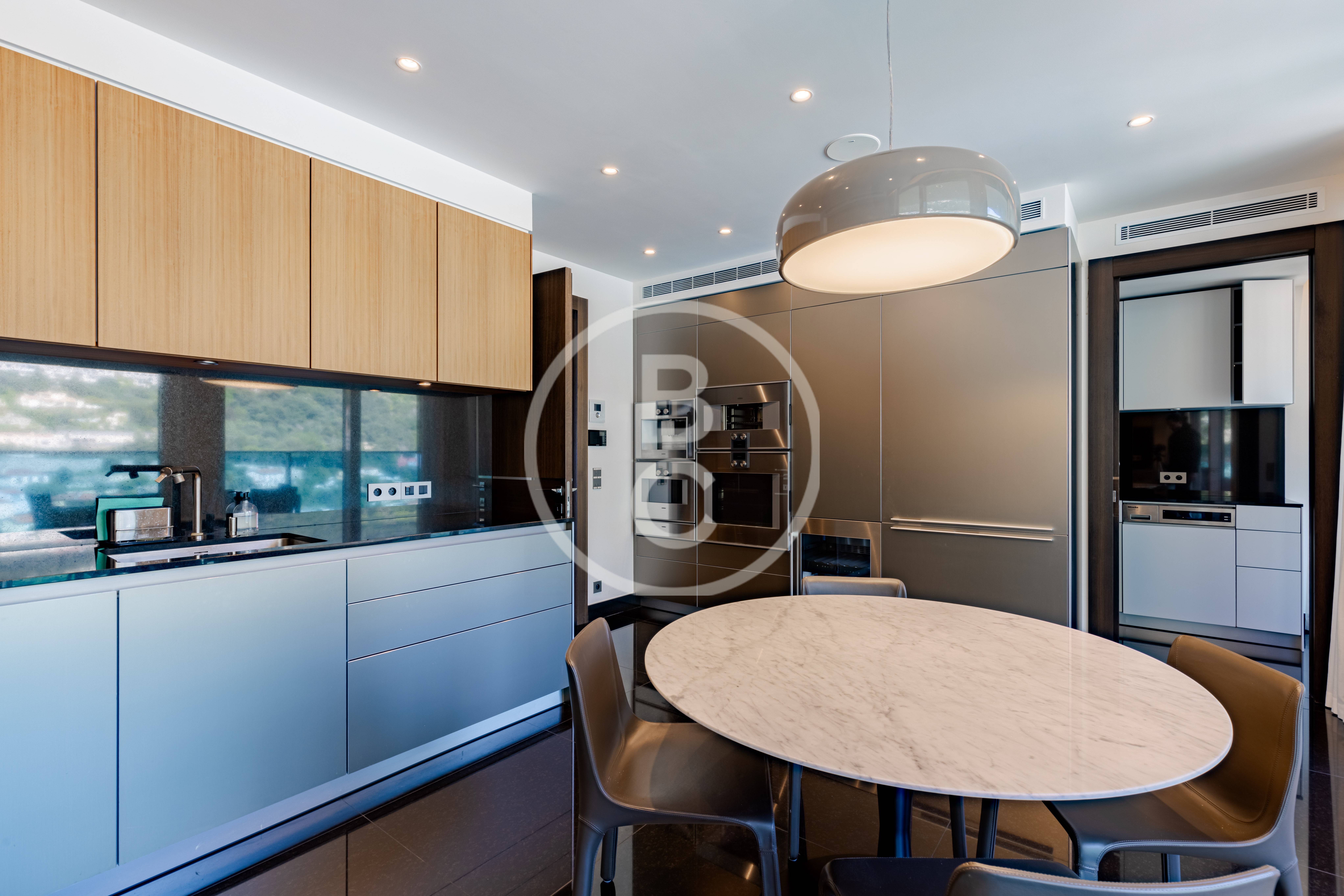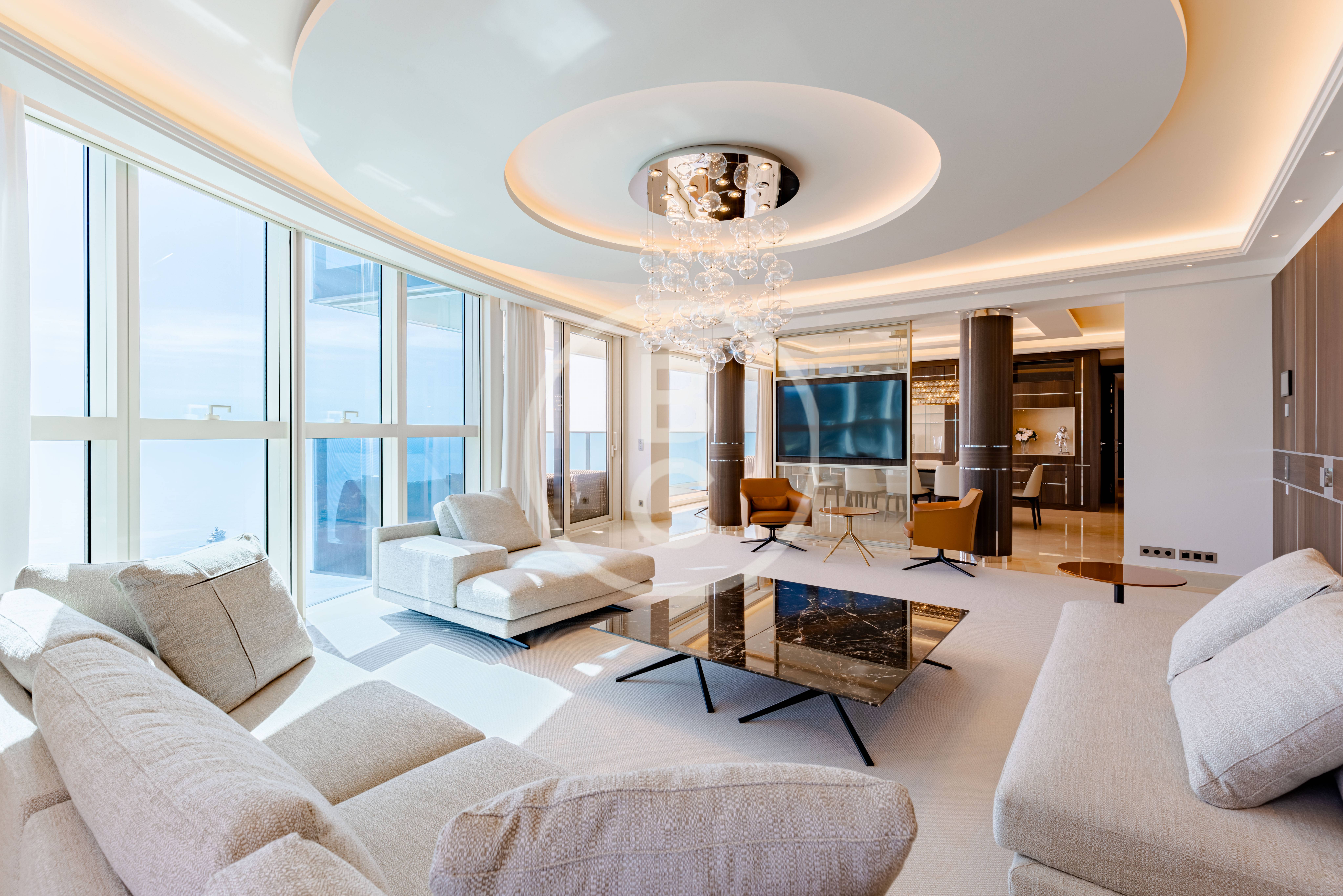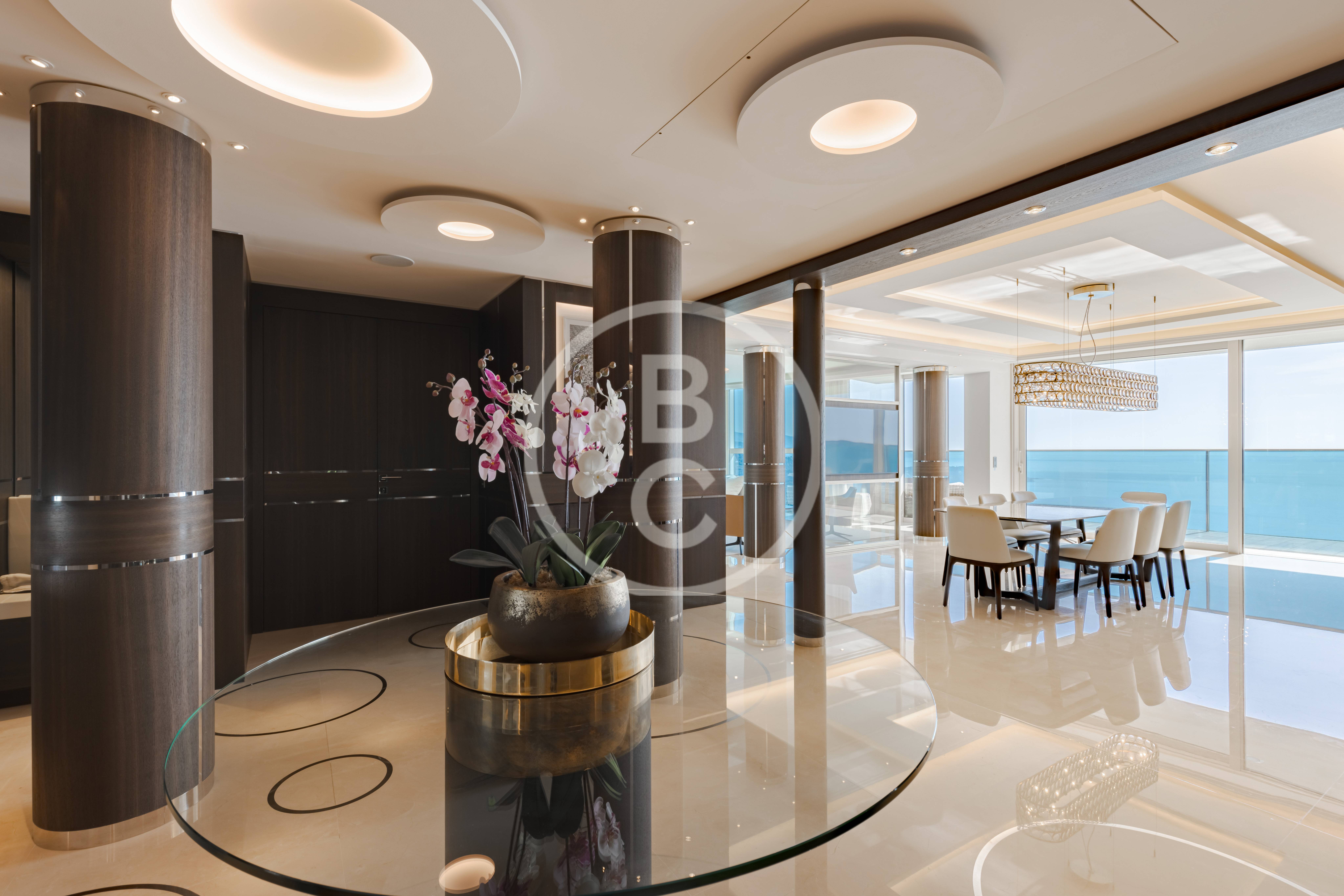 Cet appartement d'exception est situé dans les plus hauts étages de la célèbre Tour Odéon. Meublé et décoré par un architecte de renom, ce 6 pièces propose un style unique, façonné avec des matériaux nobles.