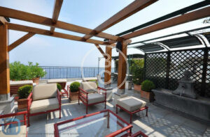 Composizione: un ingresso con armadio, un doppio soggiorno/sala da pranzo che si apre su 2 balconi, una camera matrimoniale con armadi e bagno privato, una seconda camera da letto con bagno, entrambe apribili su una terrazza sul retro, uno spogliatoio, una lavanderia, un ufficio, una cucina indipendente attrezzata, accesso tramite scale alla terrazza sul tetto arredata con un soggiorno all'aperto e una cucina estiva, un pergolato con fontana. panoramico.