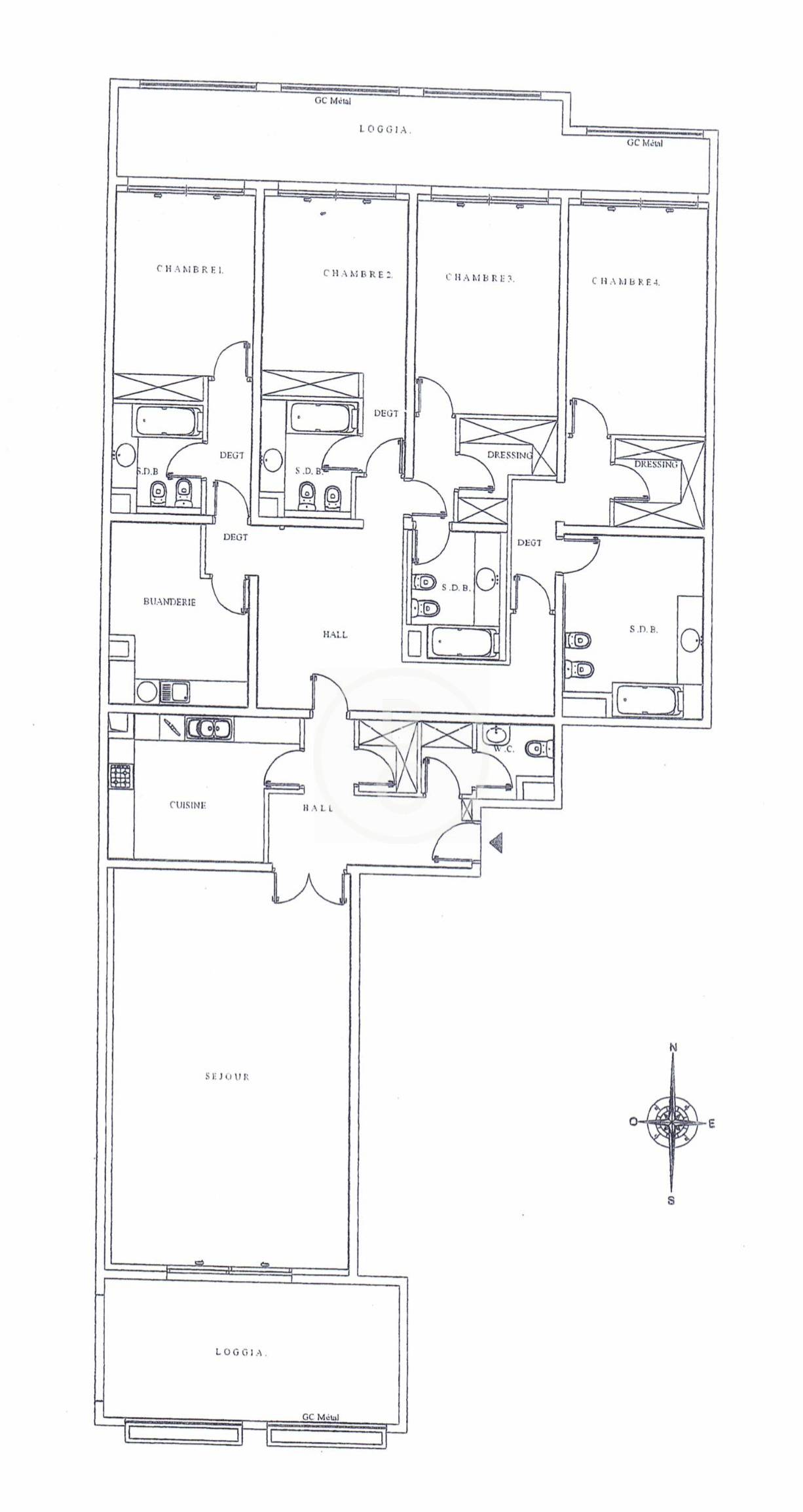 It consists of an elegant entrance hall, a large living room opening onto a loggia facing the sea, as well as a fully equipped kitchen. The sleeping area, perfectly distinct, includes a pleasant TV lounge, four bedrooms opening onto a rear loggia — two of which have walk-in closets and two with fitted wardrobes — each with its own full bathroom.