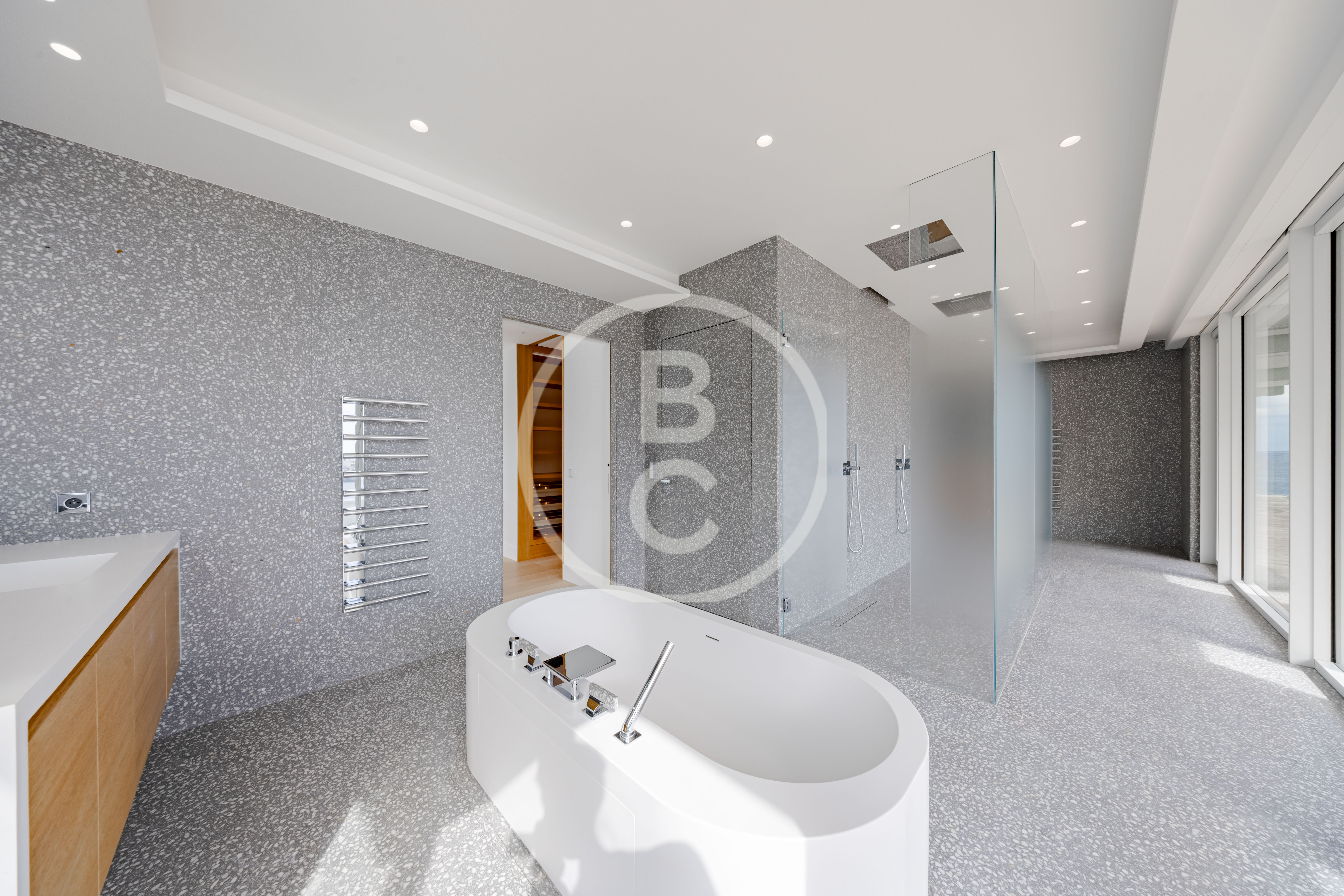 It comprises a spacious and bright living room opening onto large terraces, a modern fully equipped kitchen with dining area and separate staff access, as well as a magnificent master suite of over 100 m² with two walk-in wardrobes and a private bathroom. Two additional suites of more than 50 m² each complete the night area, ensuring comfort and privacy.