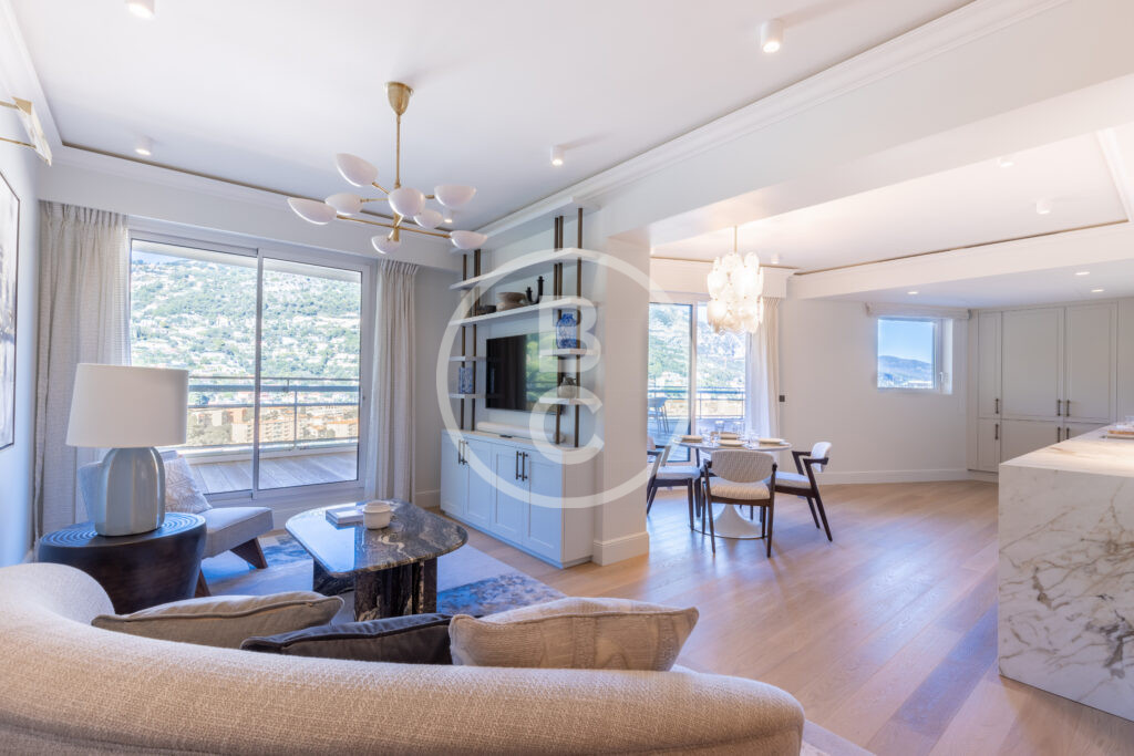 This three-room apartment is composed of an entrance hall leading to the living room, a fully equipped open kitchen, two bedrooms with shower rooms and dressing room, an office area, a guest toilet and a terrace enjoying a spectacular view of the Mediterranean and the port of Monaco.