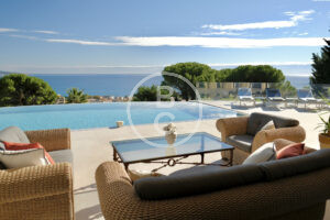 This villa is a harmonious blend of contemporary luxury and serenity. So easy it is to feel at home in this newly built villa situated at the end of a quiet cul de sac nestled in the greenery of its 2500 m2 garden. Stepping onto the natural stone terrace in front of the heated infinity pool the breathtaking view opens up towards the Italian coast.